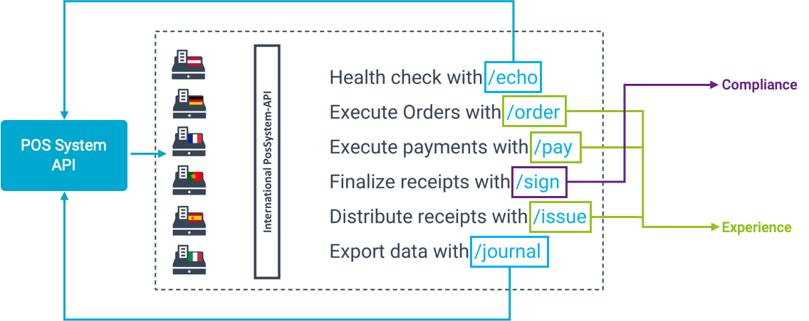 L’API du système POS de fiskaltrust sert d’interface centrale entre les systèmes POS et le middleware de fiskaltrust. Elle offre un ensemble complet de fonctionnalités, y compris la fiscalisation (ou la signature) des reçus, l’exécution des paiements via divers fournisseurs, l’impression de reçus numériques et l’exportation de données depuis le middleware.