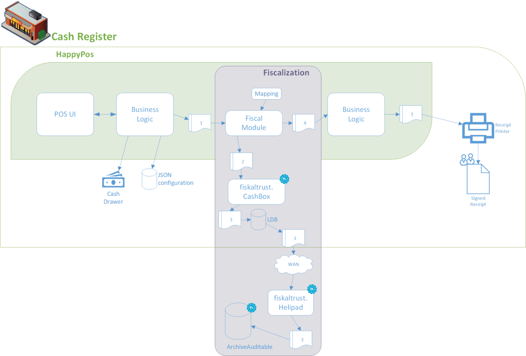 We immediately see the fiskaltrust.Middleware forms an independent block of POS system “HappyPos” and within the POS itself, there is a module “Fiscalization”. So to say, it is the ideal state to impose as few restrictions as possible on the developers. Because as we can see in the following picture, the “Fiscal Scope” is very clearly defined and does not spread over the whole system.